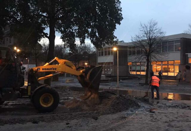 Breuk in hoofdwaterleiding zorgt voor veel wateroverlast en modder in Diemen-Zuid