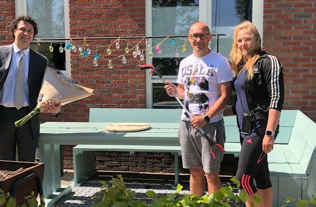 Wethouder Sikkes reikt 100e gratis afvalgrijper in Diemen uit aan bewoners Plantage de Sniep.