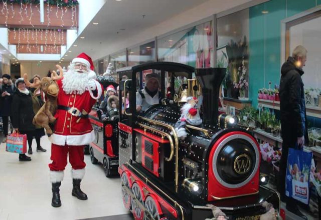 Kerstman en treintje zorgen voor feestsfeer in winkelcentrum Diemerplein.